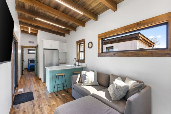 Dune View lodge is a custom-built tiny home designed to provide everything you need for a comfortable and memorable stay. Inside, you ’ll find two cozy bedrooms with queen-size beds. The home also includes a full bathroom, a well-equipped kitchen, A/C, heat, and Wi-Fi for your convenience. Step outside to your private patio overlooking the dunes and enjoy the added convenience of trailer parking and direct access to the dunes right from your doorstep..