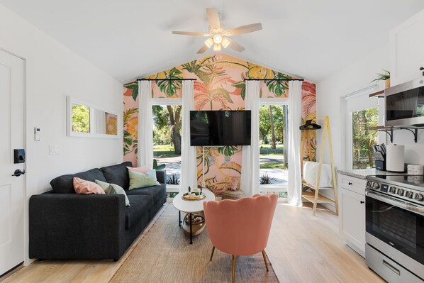 Step inside using our keyless entry smart locks and be greeted by the modern boho-tropic decor that adorns every corner of “The Hummingbird” and “The Flamingo.” Both connected units feature new everything, including the furniture, beds/mattresses, Smart TVs, appliances, linens, pillows, towels and homeware. The “Hummingbird” living room boasts a 65-inch smart TV and “The Flamingo” features a 55-inch smart TV that provides the perfect setting for movie nights or relaxation after a day of exploring. Stay connected with free WiFi throughout the property and easy temperature control systems.