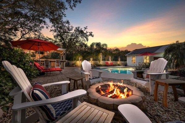 The backyard Oasis was designed with complete privacy, relaxation and comfort in mind. The Tiki Hut, solar heated pool, hot tub and firepit create the perfect outdoor haven. We are close to the intercoastal and the beach, both offer boating, kayaking, and fishing.