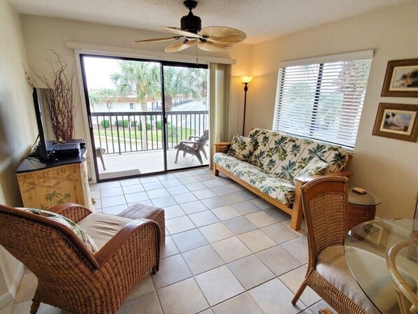 Il soggiorno è accogliente e confortevole. Siediti e goditi un film sulla TV a schermo piatto in salotto. Il condominio ha anche un lettore DVD. Dopo una giornata intensa in spiaggia o in viaggio, è un piacere venire in questo condominio per un po 'di relax tanto necessario!