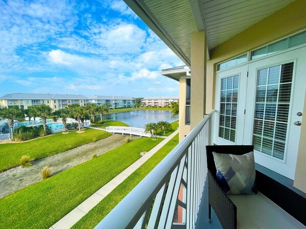 Welcome to Seaside at Anastasia Unit A302, an exquisite 3-bedroom, 2-bathroom penthouse that has been thoughtfully remodeled to provide a luxurious coastal retreat. This stunning unit features a spacious balcony with serene views overlooking the lake and pool, complemented by delightful peek-a-boo ocean vistas. Step inside to discover a meticulously designed interior, showcasing elegant Chantilly Lace Quartz countertops in both the kitchen and bathrooms. The bathrooms are equipped with walk-in custom tile showers featuring grab bars for added convenience. Freshly painted walls and new living room and dining room furniture create an inviting atmosphere, perfect for relaxation and entertaining.