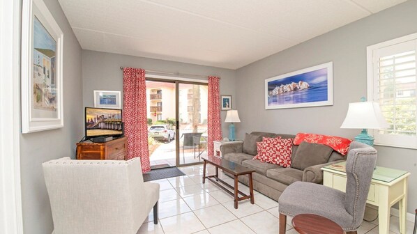 This bright and inviting retreat offers a comfortable living area with plush seating, tile floors, and sliding glass doors opening to a private patio, bringing in refreshing ocean breezes and natural light. Fully equipped with a full-size kitchen, flat-screen TV, complimentary Wi-Fi, and all the comforts of home, it’s ideal for families, couples, or groups seeking a relaxing St. Augustine family getaway. This airy retreat comfortably sleeps up to 4 with the master bedroom featuring a queen bed, private bath, and smart TV, while the guest bedroom offers 2 twin beds.