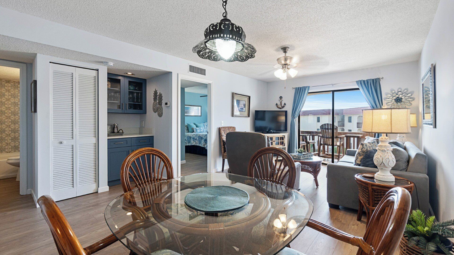 Anastasia Condos 702 is a seventh-floor, two-bedroom, two-bath condo offering 1,200 square feet of thoughtfully designed living space on St. Augustine Beach. The condo comfortably accommodates up to seven guests and is located just a short two-minute walk from the white sand shoreline.