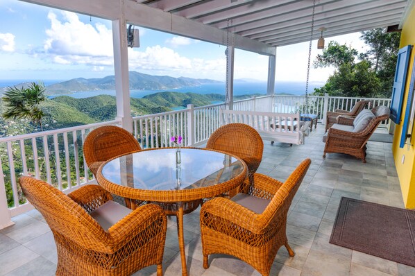 Outdoor space includes a large 500 square foot covered tile deck with outdoor furniture and a BBQ, and stunning view over the BVI! Located on Bordeaux mountain, the villa is in the rainforest part of the island with a beautiful garden and fruit trees to enjoy during your stay.