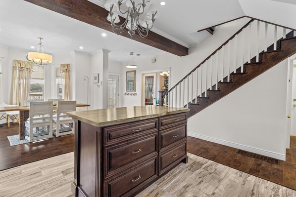 Upstairs has three bedrooms with plenty of space for additional guests and walk directly out to the top patio enjoying the rising sun over the water.