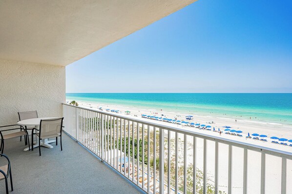 Direct Gulf front condo with 3 bedrooms and 2 bathrooms in a very popular vacation destination, Indian Shores and the Sand Castle II condominium. The private balcony offers outdoor living space for meals, sunning, watching amazing sunsets nightly and listening to the surf! The master bedroom has a King bed and a private glass door to the balcony as well as a master bathroom attached. The second bedroom has a king bed inside along with a TV for guests to use. The thirds bedroom has two twins and a TV as well. The open floor plan makes a nice space for families to share special memories. The fully-equipped kitchen has all the amenities of home including a microwave, dishwasher and refrigerator. There is a full-size washer and dryer in the condo, no need to overpack! The property also has a large heated pool, hot tub and gas grills for you to enjoy. The deck has plenty of loungers to bask in the sun. The pool deck is on the beachside of the building. This condo has FREE secure WiFi and FREE long-distance calling to the U.S. and Canada. Don't forget to ask the rental manager about FREE Perks, like weekday bikes and unlimited DVD's..