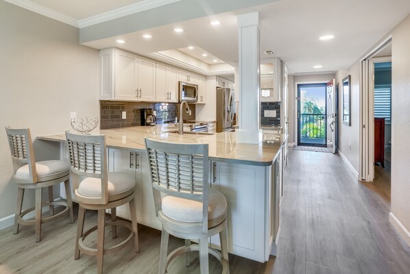 This completely remodeled, Bay front condo has a wonderful view of the Intracoastal Waterway. The gorgeous, open, fully equipped kitchen has stainless steel, state of the art appliances, granite counter top and custom cabinets. The newly furnished living room features a huge smart TV and large sliding doors opening up to the water front balcony. What a great spot to have your morning coffee watching the dolphins swim by. Your master bedroom as well as the guest bedroom feature smart TV and a comfy King size beds. Both, the en-suite main bathroom as well as the guest bath are completely remodeled with beautiful tile and large walk in showers.