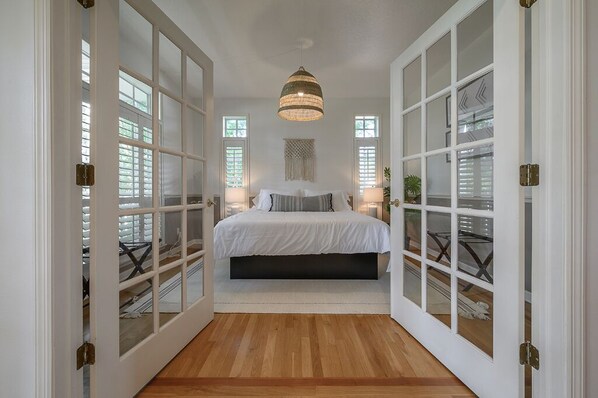 The master suite features a mix of vintage and contemporary furnishings providing a cozy and inviting atmosphere, also containing tons of built-in dressers for optimal storage space to help you settle in at home. This beautiful room has French doors leading out to a balcony overlooking the front of the property, equipped with porch chairs to enjoy your morning coffee in. It also has its own en-suite bathroom with a beautiful walk-in shower and a large soaking tub to relax!