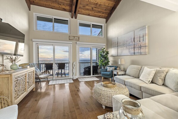 Living Room: A cozy yet spacious gathering space featuring a large six-seat sectional, two side chairs, and stunning ocean views.