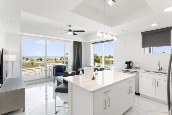 Each bedroom has a 50" TV, while the living room has a 65" TV. Every unit includes all the amenities found in traditional hotels including all linens, shower gel, shampoo, and conditioner. Whether you choose to eat in or dine out at one of the many restaurants, your unit is equipped with dishware, glassware, utensils, pots, pans, and even baking items. Also included in each unit are a blow dryer, stackable washer and dryer, full-size appliances, iron, and ironing board. Each unit will have a Keurig coffee maker, toaster, and microwave to make your mornings easy and hassle-free. As our guest, you will have 24-hour concierge service and access to the pool, a jacuzzi, a gym, and a full bar overlooking the pool. There are umbrellas, chairs and a sports area set up on our private beach area with volleyball, cornhole and horseshoes available. Should you prefer to bask in the sun closer to the water, there is a company that sets up and rents cabanas with 2 chairs.