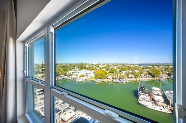 We are located on the top floor of this condo building, accessed by elevator and free parking for 1 car. You will enter the condo into a well stocked kitchen and bright living space. Relax in this beautifully decorated condo with a balcony overlooking the intracoastal water and breathtaking marina. In the living room there is a sleeper queen sofa, 2 chairs and a 55” smart TV.