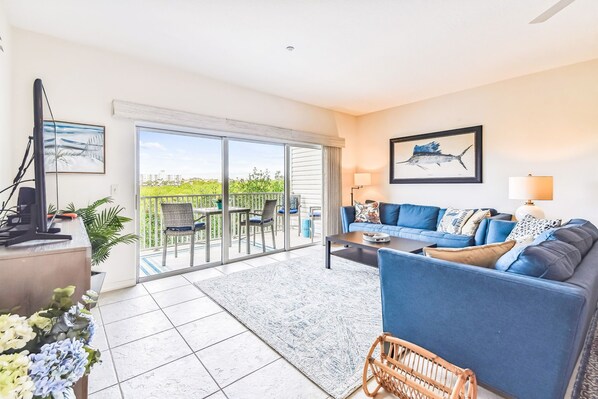 Living Room - Plush sofas with a queen pullout mattress. Outfitted with a Smart TV for endless entertainment.
