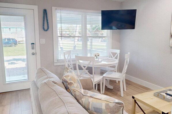 This little place was great for my husband and I. There were adequate kitchen utensils but note that it's essentials only (which was perfectly fine for us!). The property management company was SUPER responsive to any questions we had; they were wonderful to work with!! This is a short walk to the beach--literally, like 2 blocks and there was everything you could possibly think to need for a day at the beach--chairs, coolers, bikes, even a few umbrellas and beach carts! The bathroom is tiny with very little counter space, so ladies, be prepared to get creative with where to put your hair dryer/iron, beauty products, make-up etc. while you're getting ready for the day. (just a heads up for those who appreciate a little bathroom counter space) The bed was very comfortable! Plenty of sitting space in living room area as well. The only inconveniences (if you can really call it that) is the lack of drying rack or anything for drying dishes after you've washed them. Not a biggie, but would be an added convenience for future guests. Also, the ventilation in the kitchen doesn't help to pull out smoke from cooking (i.e. bacon!) so if there was a way to ventilate better, that would help. That, and better instructions on how to work the cable; we aren't Hulu-savvy, so it took us a bit to figure out which app was for regular cable TV...As you can see, all very minor suggestions that don't really take away from the overall satisfaction of the place. We would definitely stay here again!!