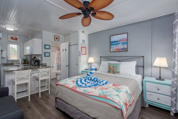 This was a great place for my husband and I to stay. It is on the smaller side but we knew that from other reviews. You don’t need too much space when you’re there to enjoy the beautiful beach which was so close. The bed was comfortable and the unit had everything we needed for coffee and quick breakfasts or packing lunches for the beach. The camping chairs that were included were a plus for the beach. Only issue we had was we couldn’t get the ceiling fan to work but ended up not needing it as the AC was sufficient. Would definitely stay again.