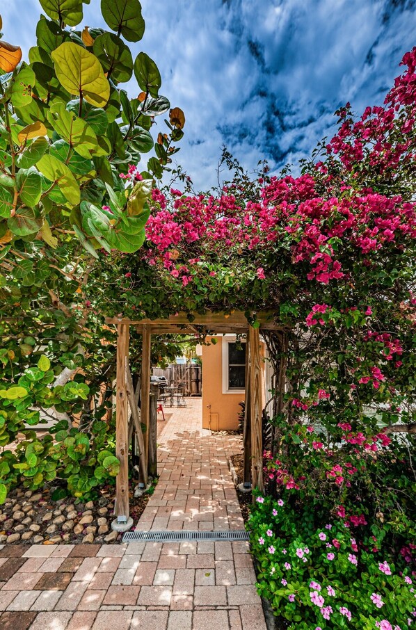 Welcome to our unique triplex, cottage-style home, which is minutes from Downtown Dunedin. Only a short walk to Main Street and a 12 min drive to Honeymoon/Caladesi Island! Walk to the Pinellas Trail, breweries, eateries, waterfront marina, and Blue Jay baseball stadium. Enjoy award-winning cuisine, live entertainment, and breathtaking sunsets before returning to the peace and quiet of your own private area. Dunedin is a gulf cart friend city with local rentals available to cruise around town.