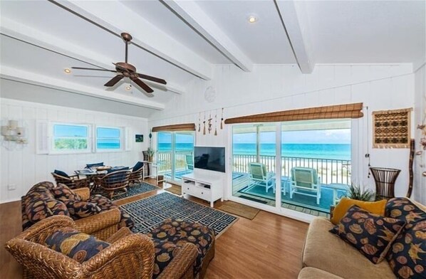Property is directly on the beach. The lanai/covered deck is wonderful to enjoy the view and still be in the shade.