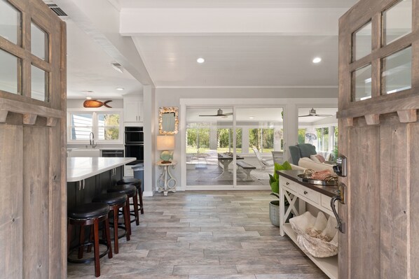 Enter through the front door and you are in an open living space with ample seating for TV viewing and socializing with the guests in the kitchen or at the breakfast bar. You can also enter the sunroom from the sliding glass doors in the family room or the door leading off the kitchen. The kitchen features a side-by-side refrigerator, gas range, dishwasher, charming farmhouse sink, wall oven and microwave. Coffee lovers will have use of a Hamilton Beach Flex Brew coffee maker (single serve and drip).
