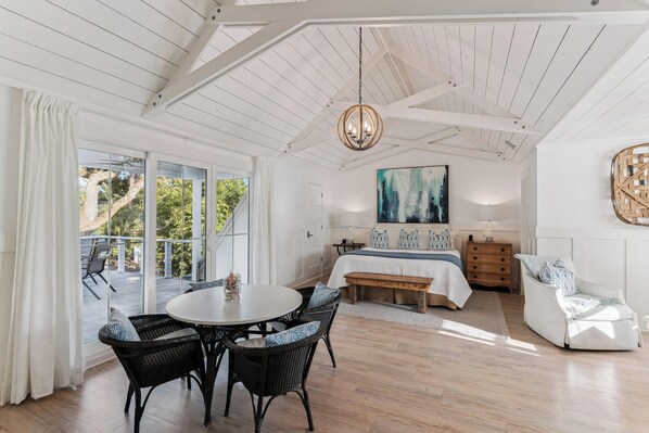 * King Suite - Upstairs suite with a king bed, TV, sitting area, dining table and access to the open deck. This suite has an adjoining bathroom with combination tub/shower.