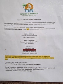 This was a last minute booking after having to leave another VRBO that was too bad to stay in with strong mildew problems. This location was okay but not close to amenities location wise. The hotel just above it that I first went to in error in the dark (same driveway) was pretty nice and they helped find the right place, so that just made getting to this room more disappointing. Parking was good, the owner (I assume) or at least person managing the reception was super nice and helpful. They clearly had a rough time dealing with hurricane damage and I feel for them, but on vacation you don'e want to experience other folks problems. The room had a nice view, but the love stopped there. The lighting was so dim you almost couldn't see. It was actually hard to capture with a cell phone camera because of the low light! The funny thing was they got dimmer the longer you left them on. The bed mattress was pretty aged I think and you could hear the worn springs in it and it was a bit lumpy. It was a short stay so we just lived with it and it was a last minute save after a horrible experience at another booking we had to walk out of even if we lost the investment, so we were glad for that. I thought long about even saying anything, but I also hope nobody else has a letdown either... so here you go!
