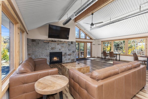 The condo features a full kitchen with everything you need to prepare meals or apres ski snacks. It features stainless steel appliances, tile backsplash, great lighting, nice cabinets, and a barnwood island with log barstools. The log barstools match the adjacent log dining table, and the beautiful floors throughout the main floor give it a nice flow with a consistent look and feel. The living room has a very comfy couch and additional seating positioned to allow you to enjoy the gas fireplace, HDTV, and those amazing views.
