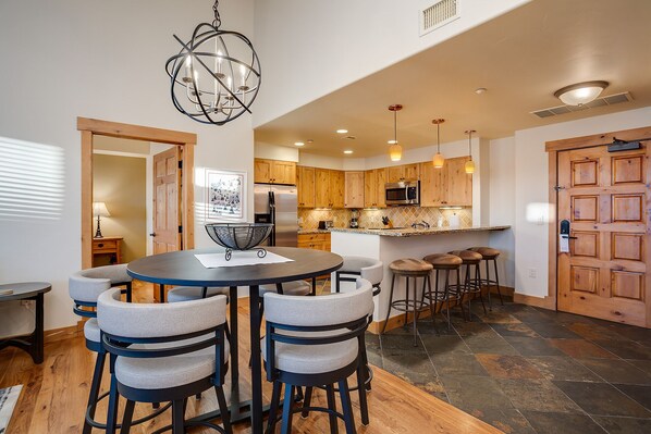 Questa residenza al piano superiore a Aspen Lodge offre viste impressionanti sulle piattaforme piatte e sulla valle di Yampa. Dispone di pavimenti in legno, soffitti alti, controsoffitti in pietra, armadi in legno caldo e rivestimento, piastrelle in ardesia, dettagli in ferro battuto e arredi eleganti. Sarà facile godere e intrattenere in questa residenza, con la famiglia e gli amici, in estate e in inverno!