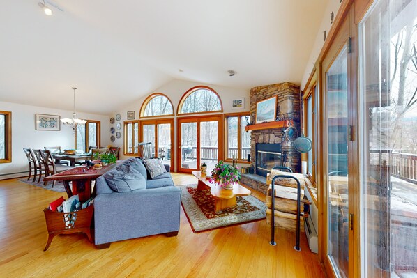Right at home, enjoy morning coffee and a tree-lined view on your expansive deck when it’s warm enough, or spend cozy winter mornings sipping hot cocoa in front of the wood-burning fireplace. The main living area boasts vaulted ceilings, warm hardwood floors, and an open layout, making it ideal for gathering together. The chef will appreciate the well-equipped kitchen with a full suite of appliances, including a double oven, and little helpers can perch on the barstools to help. There’s room for everyone around the large dining table at mealtime, and the dishwasher makes for easy cleanup.