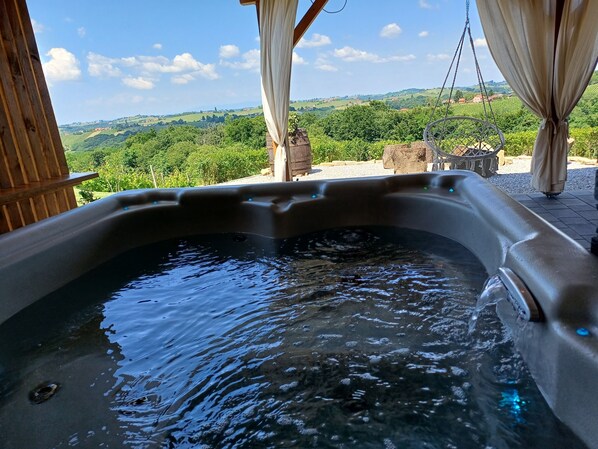 Romantic and family getaway home with jacuzzi, hobbit sauna, terrace, and vineyard views.
