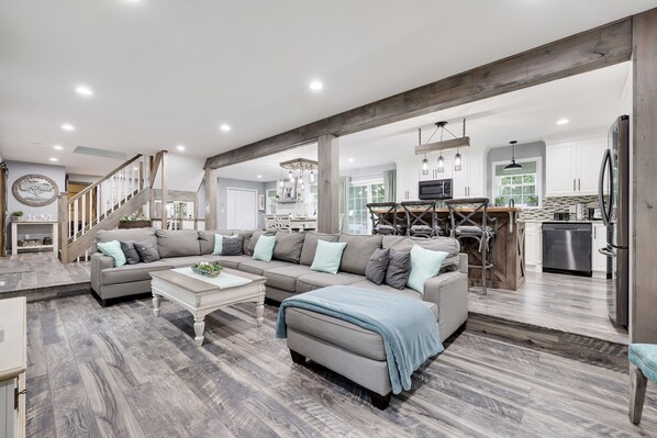 Features: 4 bedrooms (1 King + 5 Queen beds), 2 bathrooms, open