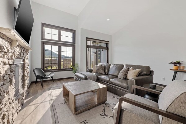 Upon arriving make yourself comfortable on the plush couches, perfectly arranged to take in the incredible mountain views. Here, you'll enjoy a moment of relaxation while reading a new novel or snuggling next to the fireplace on a snowy night.