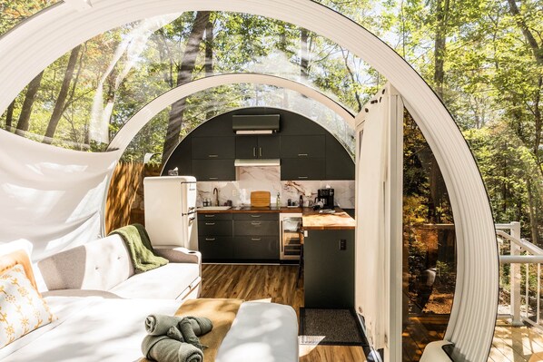Welcome to Kit’s Retreat, our most luxurious Sunken Escapes stay. Sleep under the stars in this stunning glass dome with a queen bed, pull-out couch, soaker tub, fireplace, wine fridge, outdoor shower, BBQ, and total privacy in nature. Perfect for romantic getaways or stylish solo escapes. Kit’s Retreat is a one-of-a-kind luxury dome nestled in the woods at Sunken Escapes. With sweeping glass walls and a vaulted ceiling, it offers an unforgettable experience of sleeping under the stars without sacrificing comfort. Inside, you’ll find a queen-size bed, a pull-out couch, a full bath with a soaker tub, a cozy fireplace, a stovetop, and even a wine fridge. Step outside to your private outdoor shower, BBQ, and lounge area surrounded by nature. You’ll have full private access to your dome, deck, and outdoor amenities. On-site, all guests are welcome to use the shared shoreline fire pits, washer toss, and the wood-fired barrel sauna. We also offer free kayak access, and bike rentals are available for an extra charge. Wagons are available in the parking lot to help transport your belongings to your dome. Check-in is contactless, but we’re local and happy to help. Message us anytime if you need recommendations or assistance—we love helping guests find the best wineries, hikes, or hidden gems nearby. You may not see us, but we’re always just a message away. Kit’s Retreat is tucked deep in nature—expect peaceful sounds, occasional wildlife, and total relaxation. Please bring reusable water bottles and minimize waste when possible. At night, we ask guests to keep lights dim to preserve the dark sky experience. The sauna is shared and available on a first-come, first-served basis. Don’t forget to check the Nova Scotia burn safe website before lighting any fires.
