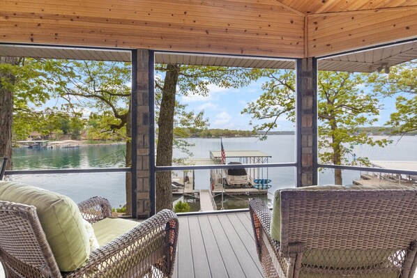 Excellent view. Good setup for multiple families. Screened in porch with large dining table. Great outdoor spaces.