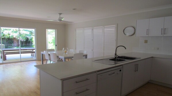 C'è una cucina moderna con lavastoviglie e bar per la colazione e si apre su sale da pranzo e salotto che sfociano sul ponte posteriore con barbecue e zona pranzo all'aperto.