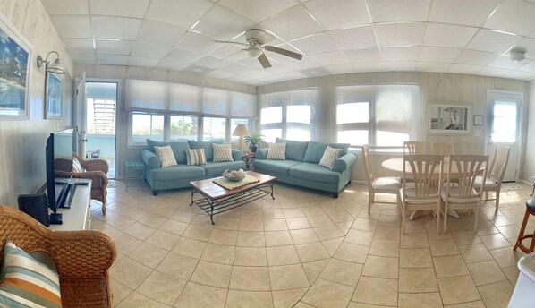 Entra dal lato destro dell'edificio, in Open space in Kitchen and Living Room. WI-FI in ogni unità. C'è una regina Sleeper in soggiorno. Aprire la porta sul retro in veranda con sedie a dondolo. Uscire dal portico dello schermo al patio esterno per il vostro uso. Cammina lungo il corridoio c'è una camera da letto con 2 letti matrimoniali, cassettiera, armadio e una TV a schermo piatto. In corridoio è un bagno completo con vasca / doccia. Prossima è la seconda camera da letto con 2 letti queen size, cassettiera, armadio., Bagno completo con doccia. Un rotolo è nell'armadio. 3a camera da letto è la master suite, perfetta per nonni e in legge 1 letto matrimoniale, 1 bagno completo con doccia, TV a schermo piatto, poltrona, cucina efficiente con macchina per il caffè, forno a microonde, frigorifero e fornelli., Tavolo e sedie. Roll-away nell'armadio.