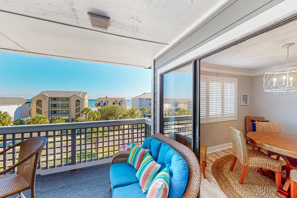 Ocean views abound throughout the living, kitchen, and dining areas, as well as the large furnished balcony. The full kitchen makes it easy to plan and prepare home-cooked meals. Comfortable furnishings and smart TVs welcome casual comfort and entertainment between outings. Updated mattresses ensure a restful night's sleep throughout your stay. Additional perks include central air-conditioning, free WiFi, a private washer/dryer, a hair dryer, and an ironing board. All linens are provided for bedrooms, bathrooms, and the kitchen. Beach chairs and umbrellas are conveniently available for guest use.