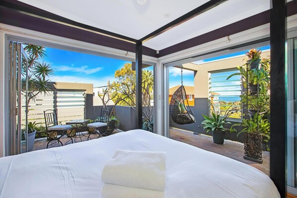 This architecturally designed space gives ocean views whilst enjoying breakfast in bed or a coffee on the wrap around balcony which includes a foliage screened outside shower.