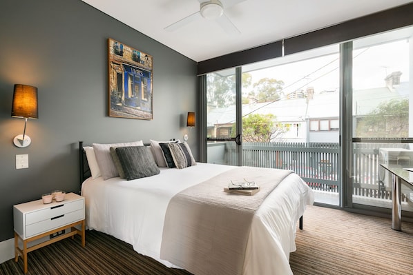 Camera da letto principale con bagno privato, letto matrimoniale, accappatoi, pendenti sul comodino, portasciugamani riscaldati e porte che si aprono sul balcone