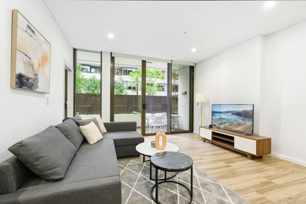 The living room features a designer sofa and a Smart TV with access to multiple streaming platforms, allowing you to relax, watch movies, or chat with friends and family.