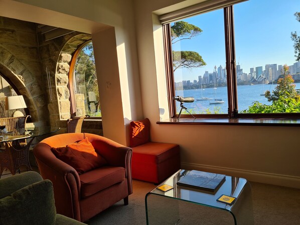 Salite un paio di passi dal prato davanti e potete entrare nell'appartamento attraverso una porta privata che conduce nella sala da pranzo e nella zona salotto, che hanno una vista mozzafiato sul porto tra cui il Teatro dell'Opera, Harbour Bridge e lo skyline della città. Cenare di notte con le luci della città e del porto come sfondo.