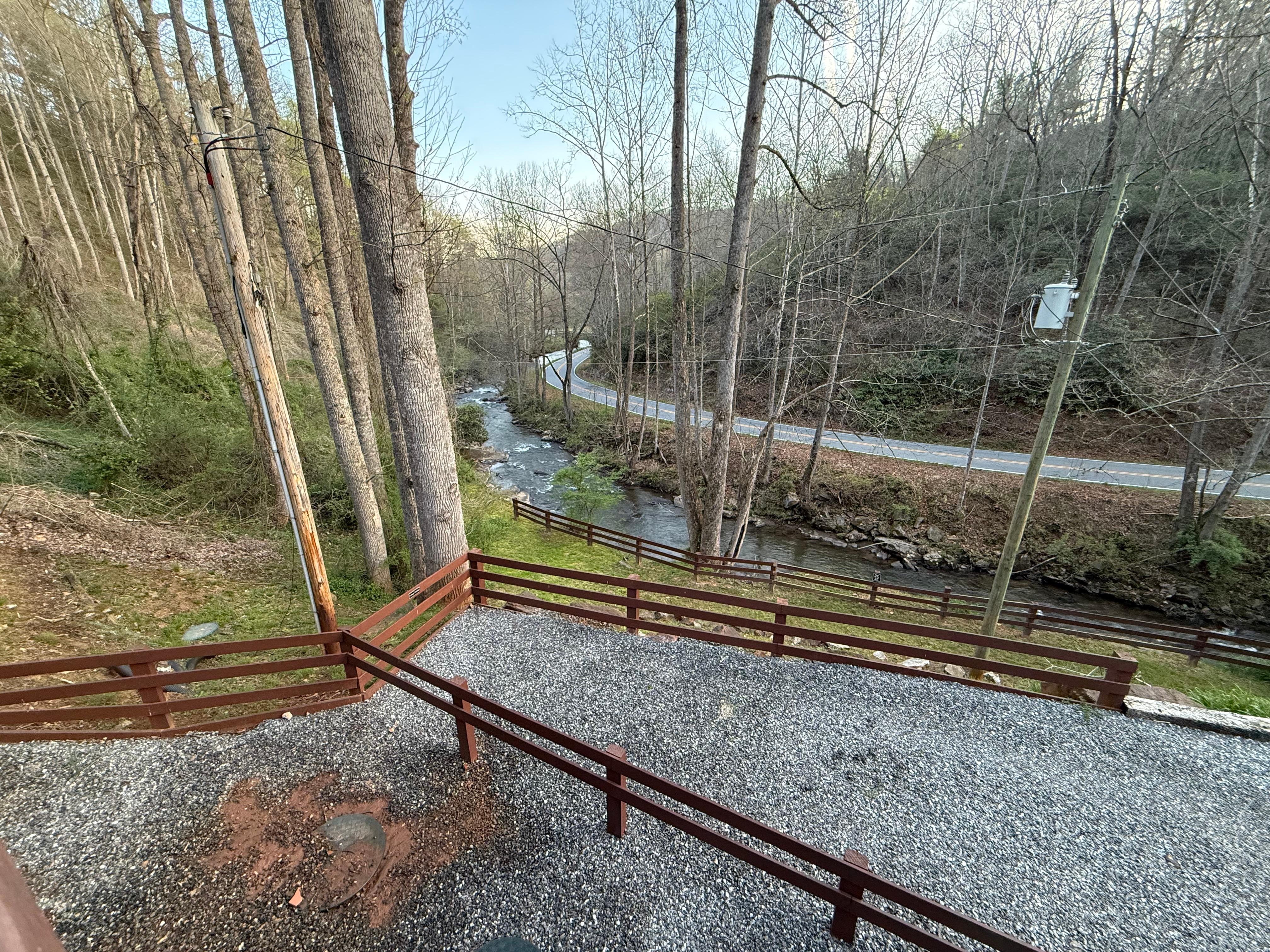 Exterior view of property is misleading. You have to cross a one vehicle "bridge" on the property to access home. Home is on a steep incline. One parking spot is beside a retaining wall that is close to the drop off to the creek. Creek advertised as a 6 min walk but is in front of home. The other parking spot will require you to use your emergency brakes. Maneuvering with your vehicle (i.e., backing up, turning around) on this property is not for the average driver.