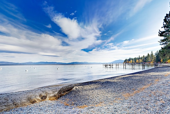 This rental includes access to the Tahoe Park Beach Association, which offers 800 feet of beach and two deepwater piers as well as a boat launch, playground, expansive lawn area, volleyball court, basketball hoop, swing set, and horseshoe pits.