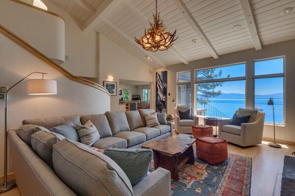 You will love the feeling of Starry Nights as the moonlight pours through the kitchen and living room windows while you settle in with your evening glass of wine. Open the windows and let the outside in, and let the surrounding natural mountain and lake beauty overcomes you. The landscaped backyard and flat access offers a perfect spot for kids to play and adventure. Inside, the open floor plan and abundant natural light create the perfect setting to relax. The fully-equipped modern kitchen offers lake views. Gaze out at the wooden boats, kayaks and parasailers enjoying the lake, while preparing your family feasts. At day's end, retire to cozy bedrooms, comfortably outfitted with down bedding and fluffy pillows. Starry Nights lakefront vacation rental is ideally located and is just the right size to spread out yet stay connected with your party. Come and see for yourself!