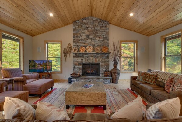Sala grande: caminetto a gas con lavorazione in pietra personalizzata, soffitti a volta, ampie finestre, arredi di lusso, pavimenti in legno di hickory annodati, ventilatore a soffitto, incantevoli viste alberate