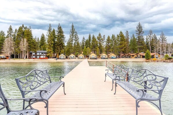 Accessible from the living room via sliding glass doors is the beachside patio complete with an outdoor table, chairs, and a large umbrella. The private beach right in front of the cabin and extending to the right, as well as a second private beach a stone's throw to the left, is only accessible to visitors staying at the property complex known as The Franciscan Lodge. This cabin is located within the complex and has access to all the Home Owner's Association (HOA) seasonal amenities including a pool, a volleyball court, BBQ grilling stations - one just outside the cabin, and a private pier!