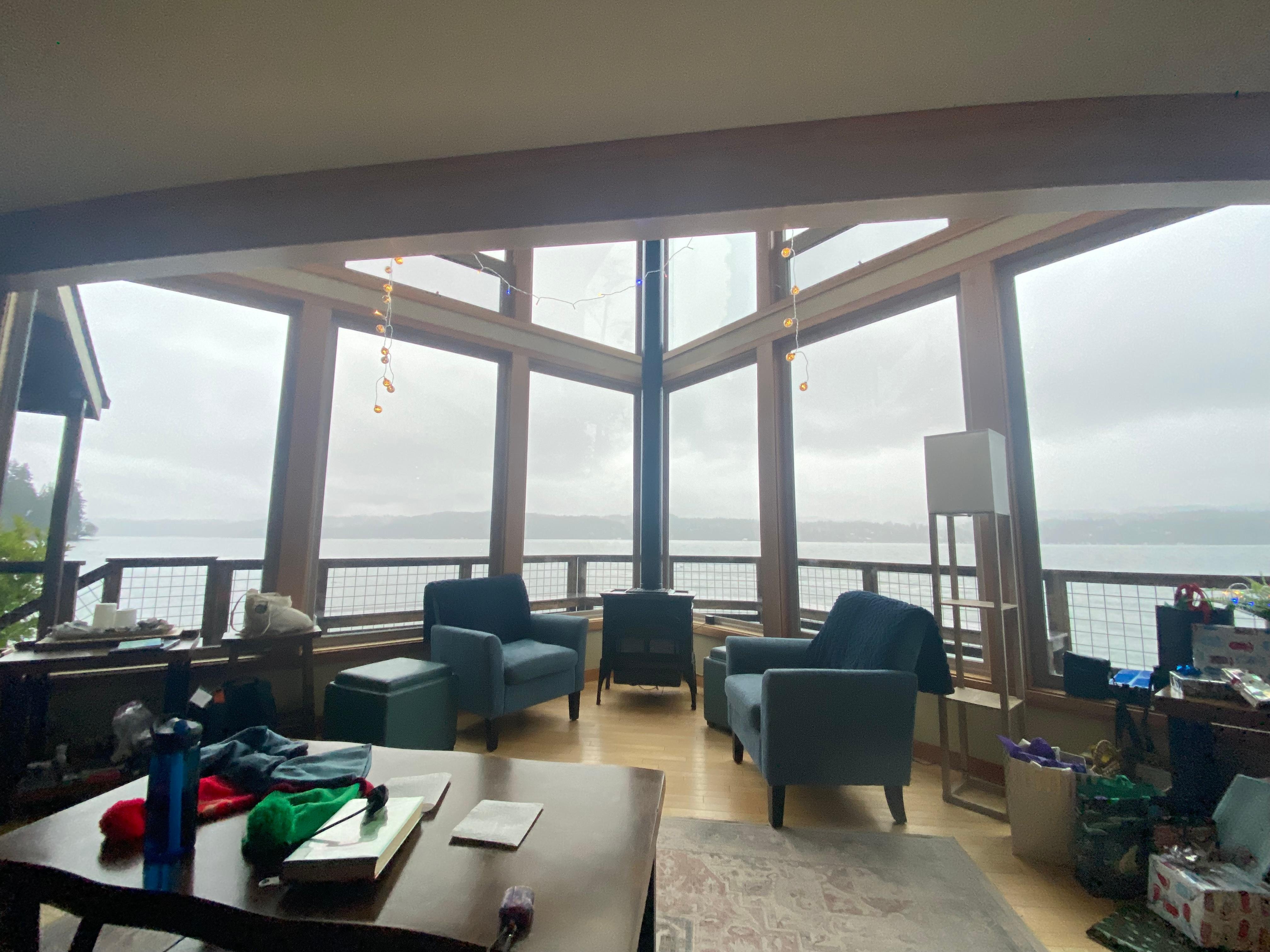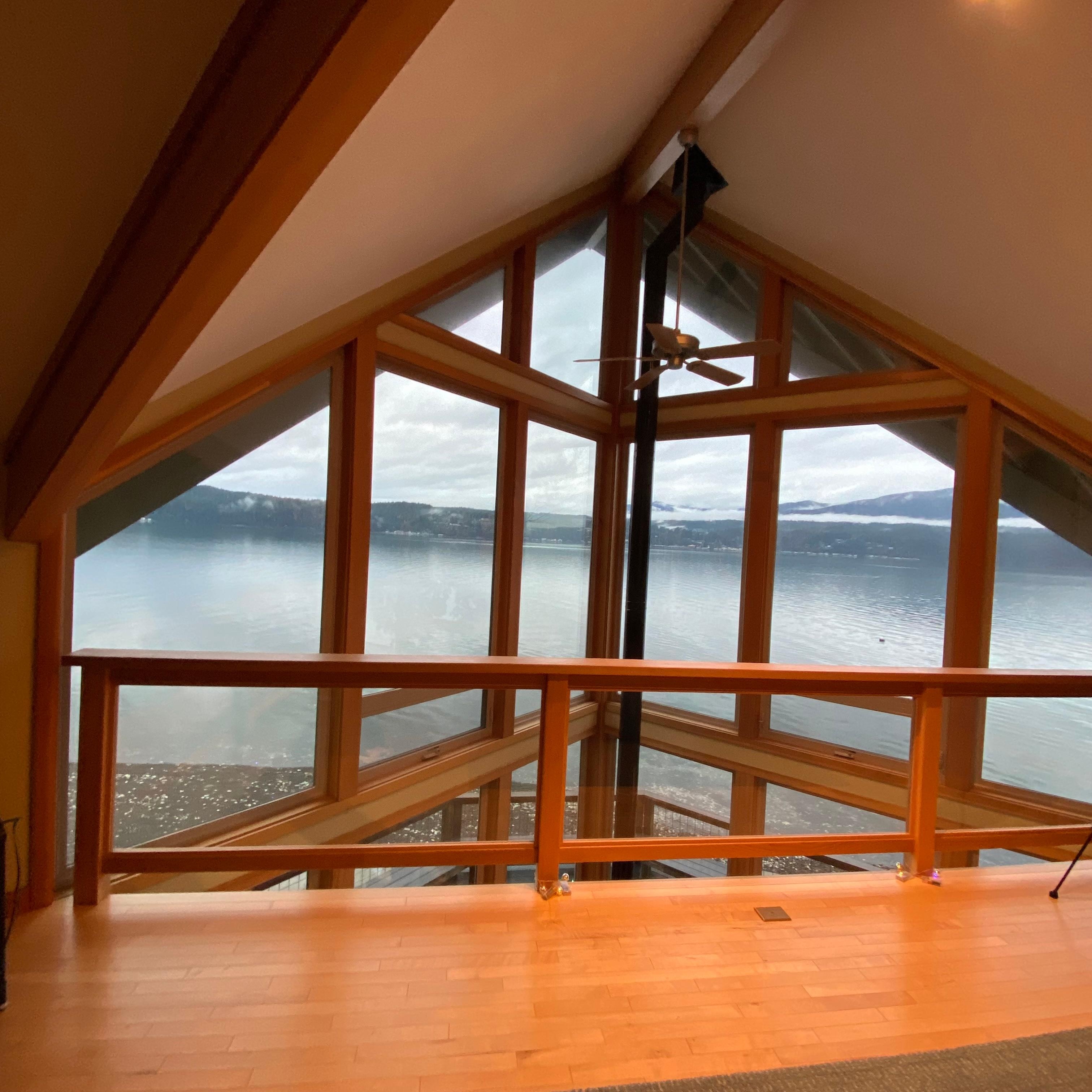 Inside, find an open great room with floor-to-ceiling picture windows showcasing the 180-degree views of the water and the opposite shore. Detailed with maple hardwood floors, an ambient gas stove, and a large smart TV, there’s plenty of room for everyone to relax. Spend quiet afternoons sipping your beverage of choice on the huge deck and watching the sun dip below the mountains.