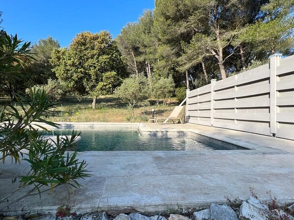 Outside, you'll find several relaxation areas. Two terraces will allow you to spend pleasant moments with family or friends in the shade of its beautiful arbor, listening to the birds and cicadas of our beautiful Provence. On the second level, the pool will welcome you for a refreshing swim and relaxation. Its view of the pine forest will allow you to completely disconnect. An outdoor BBQ area is also available for cooking delicious meals.