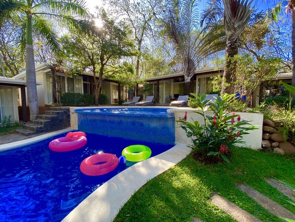 Rilassati al The Breeze, il più lussuoso rifugio di lusso moderno di Tamarindo (questo complesso è composto da 5 ville: Villa Cortes, Villa Coco Bolo, Villa Ron Ron, Villa Almendro e Villa Joe Guanacaste). Situata a circa 150 metri dalla spiaggia, la nostra splendida casa vacanze si trova in un perfetto ambiente tropicale. Un albero di Guanacaste magnificamente conservato accentua la bellezza del terreno. I lussureggianti giardini tropicali sono intrecciati intorno a questo sensazionale gioiello con due camere da letto e due bagni, che si apre su una piscina a due livelli a cascata e una zona relax - perfetta per un tuffo nell'acqua o un pomeriggio per godersi i ricchi raggi del sole del Costa Rica.