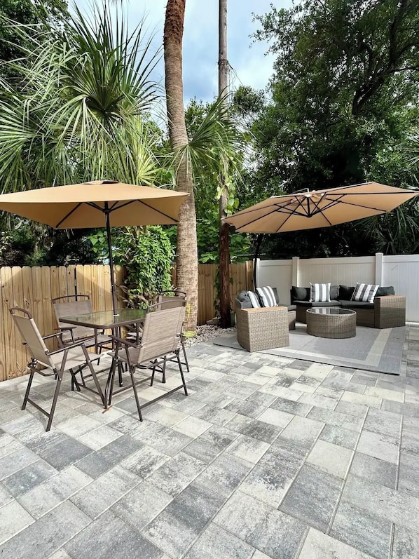 -Outdoor space: Enjoy a private back patio with comfortable seating/tables.