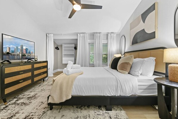 There are 2 bedroom total, both located upstairs. Each bedroom has a luxurious queen-sized bed and ample storage space for your belongings. They are both elegantly decorated and have a large window that lets in natural light to make the room feel warm and welcoming. The master bedroom has a smart TV.