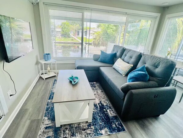 Relax in this peaceful 1BR/1BA waterfront apartment with a private entrance offering stunning views of a saltwater canal that leads to Tampa Bay.