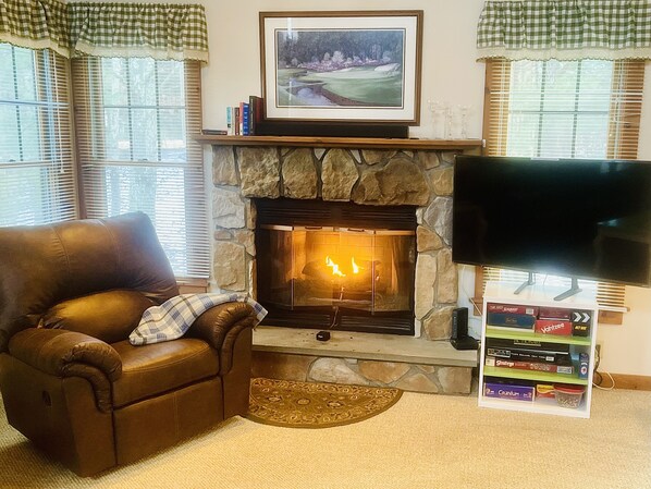 The first floor has an open floor plan connecting kitchen, dining room and living room. You can relax in the living room next to the fireplace watching DVDs or stream through your favorite player (Roku, Netflix, Hulu, Amazon Prime, etc.), or listen to your favorite tunes by playing CDs or your phone.